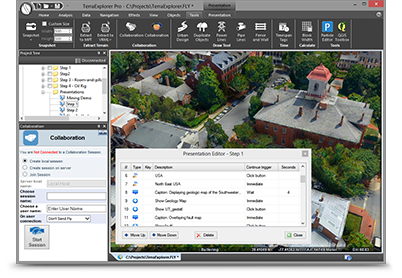 Users can navigate through and perform advanced terrain analysis and basic editing of high resolution 3D world environments created by fusing aerial and satellite photography, terrain elevation data and other 2D and 3D information layers.
